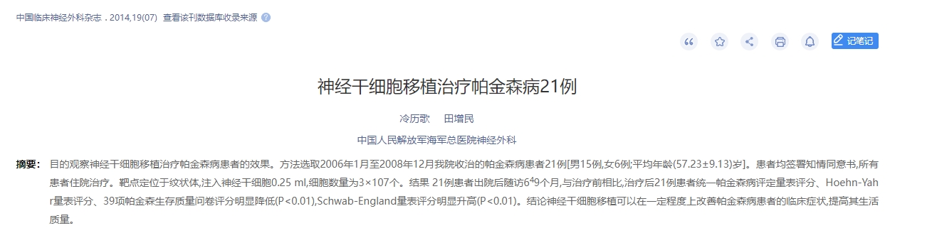 2014年,中國人民解放軍海軍總醫(yī)院神經(jīng)外科進(jìn)行了一項(xiàng)神經(jīng)干細(xì)胞移植治療21帕金森病的臨床案例。