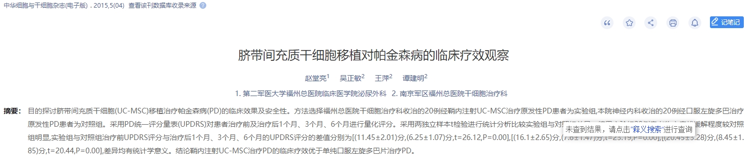 2015年,第二軍醫(yī)大學(xué)福州總醫(yī)院發(fā)表了一篇臍帶間充質(zhì)干細(xì)胞移植對帕金森病的臨床療效觀察的文章。