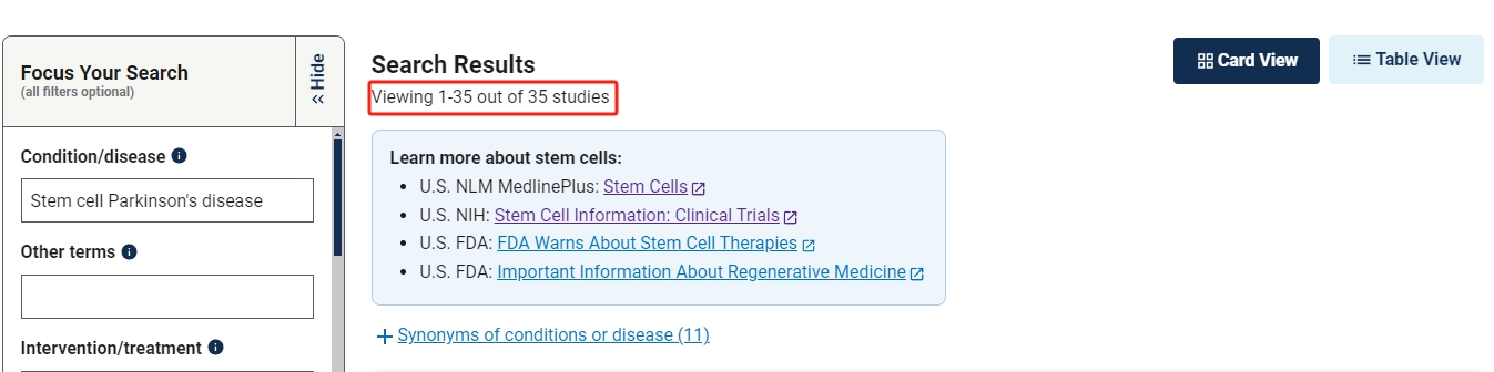 截止2024年2月,在美國國立衛(wèi)生研究院的最大臨床試驗(yàn)注冊庫clinicaltrials.gov網(wǎng)站上注冊的有關(guān)干細(xì)胞治療帕金森病的臨床研究項(xiàng)目有35項(xiàng)。