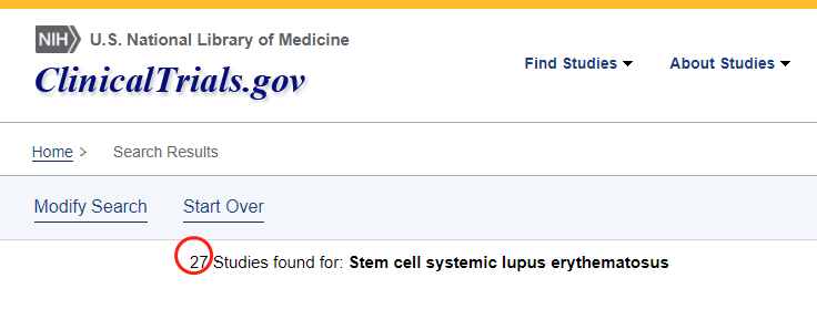 截止2022年12月,在美國國立衛(wèi)生研究院的最大臨床試驗(yàn)注冊庫clinicaltrials.gov網(wǎng)站上注冊的有關(guān)干細(xì)胞治療系統(tǒng)性紅斑狼瘡的臨床研究項(xiàng)目有27項(xiàng)。