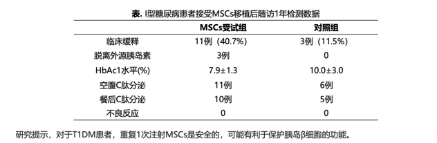 2021年,南京市鼓樓醫院內分泌科朱大龍教授團隊在《臍帶間充質干細胞治療中國成人Ⅰ型糖尿病重復移植:一項開放、非隨機、平行對照臨床試驗》這項研究中,治療組和對照組的改善數據如下: