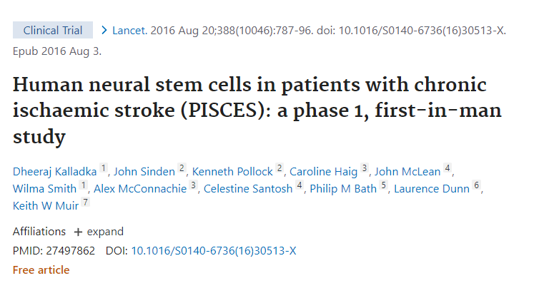 一項(xiàng)關(guān)于神經(jīng)干細(xì)胞移植治療中風(fēng)患者的為期兩年的開(kāi)放標(biāo)簽、單中心和劑量遞增臨床試驗(yàn)(NCT01151124)已經(jīng)完成。臨床數(shù)據(jù)分析表明,高達(dá)2000萬(wàn)個(gè)細(xì)胞的單次腦內(nèi)神經(jīng)干細(xì)胞劑量不會(huì)引起不良事件,并且與神經(jīng)功能改善有關(guān)。