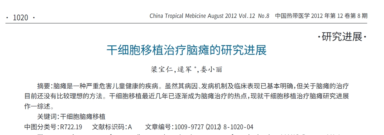梁寶仁, 逯軍, & 婁小麗.?(2012).?干細胞移植治療腦癱的研究進展.?中國熱帶醫學,?12(08),?1020-1022+1032.