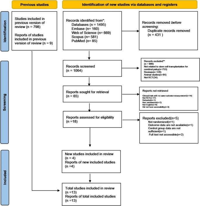 近期,國際知名干細胞雜志《Stem Cell Res Ther》發表了一項題為“評估干細胞/間質細胞移植對確診為腦癱兒童的安全性和有效性:隨機對照試驗的系統回顧和薈萃分析”的研究。該研究旨在系統評估干細胞或基質細胞療法對腦癱兒童的療效和安全性[1]。