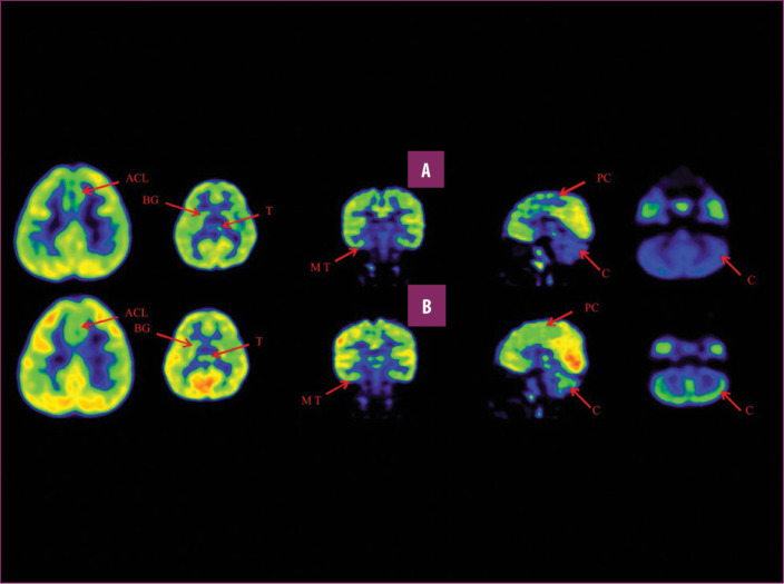前扣帶回 (ACL)、頂葉皮層 (PC)、內(nèi)側(cè)顳葉皮層 (MT)、基底神經(jīng)節(jié) (BG)、丘腦 (T) 和小腦 (C)。B 行)第一次移植后6個(gè)月后PETCT腦部掃描的干預(yù)后圖像顯示標(biāo)記區(qū)域有所改善。藍(lán)色代表代謝減退區(qū)域。綠色代表正常的新陳代謝區(qū)域。圖A和B的比較顯示藍(lán)色區(qū)域顯著減少,綠色區(qū)域增加,這表明大腦的新陳代謝得到改善。