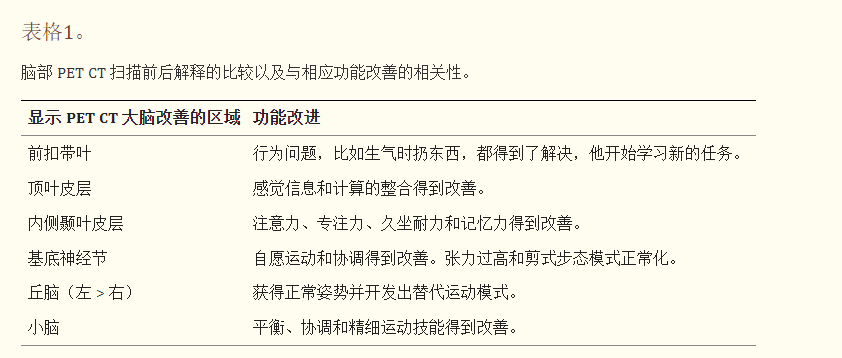 與之前的情況相比,他在矢狀面和額狀面上的體重變化有所改善;頭部、軀干和骨盆的排列也得到改善,雙側(cè)腿筋和小腿肌肉的緊繃感也有所減輕。患者開始執(zhí)行雙手任務(wù)。在認(rèn)知方面,由于他定期上學(xué),他的注意力持續(xù)時(shí)間和久坐耐力也得到了改善。GMFM評(píng)分從60.67提高到67.75;GMFCS等級(jí)由Level3提升至Level2;和FIM評(píng)分從97分提高到99分。在比較第一次細(xì)胞治療之前和之后七個(gè)月期間進(jìn)行的腦部PETCT掃描結(jié)果時(shí),前扣帶葉、頂葉皮層、內(nèi)側(cè)顳葉皮層、丘腦、基底神經(jīng)節(jié)和小腦(表格1)。