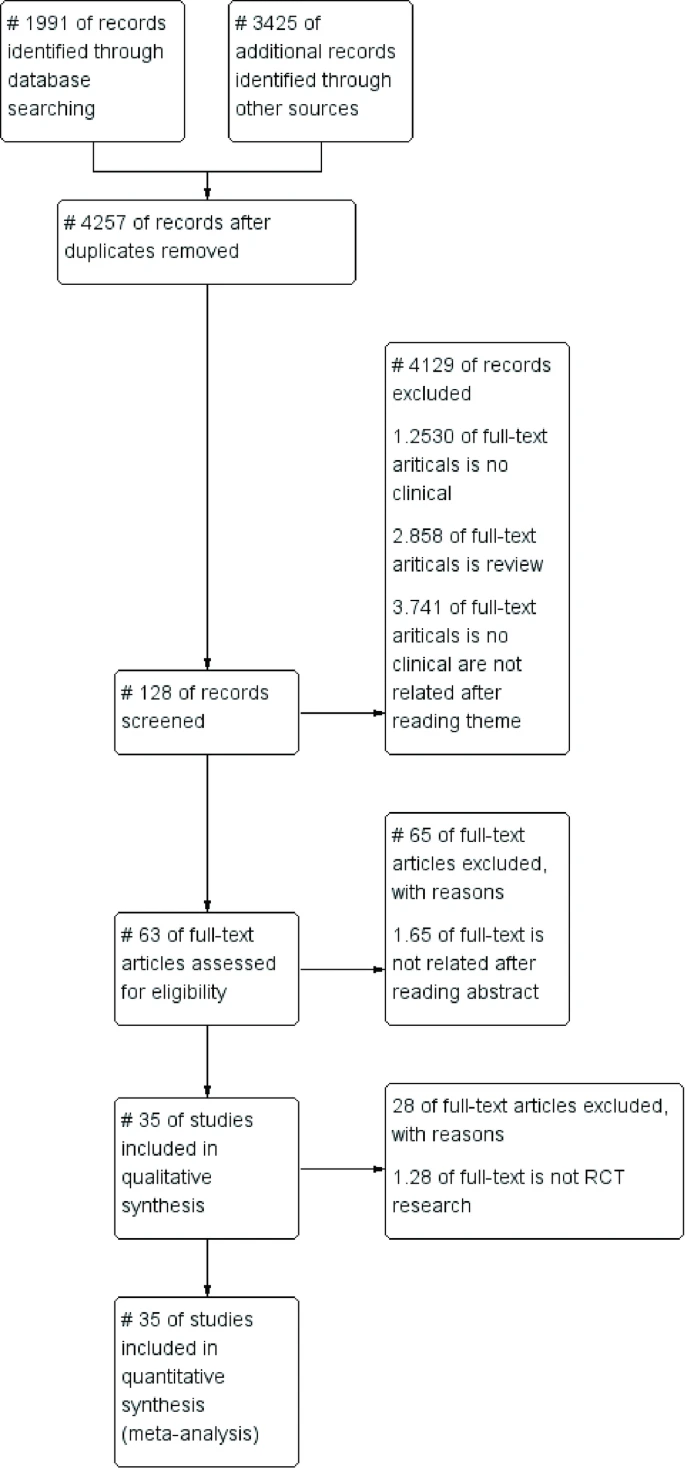 流程圖概述:通過系統檢索PubMed(1991篇)、Embase及Cochrane數據庫(共3425篇),初步納入5416篇文獻,經去重后剩余4257篇。按排除標準分步篩選:排除2530篇非臨床研究(如基礎實驗、動物研究)、858篇綜述、741篇摘要不相關文獻、65篇全文不相關文獻及28篇不符合RCT設計的文獻,最終納入35項研究進行薈萃分析(圖1)。