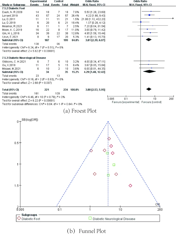 基于11項研究(8項足潰瘍、3項神經病變)的數據顯示,兩組療效高度一致,且組間無顯著差異(P=0.84)。異質性檢驗(I2=0)及森林圖分布(圖10b)證實結果高度可靠,提示MSCs對不同糖尿病并發癥的療效具有普適性,為臨床擴展應用提供了證據支持。