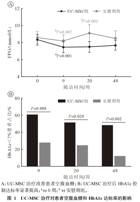 2.血糖達(dá)標(biāo)率顯著提高:UCMSC治療組患者的糖化血紅蛋白(HbA1c)水平顯著降低,并有更多患者將血糖控制在理想范圍(<7%)。與對照組相比,干細(xì)胞治療的效果更加突出,顯示了這一療法在控糖方面的強(qiáng)大潛力。