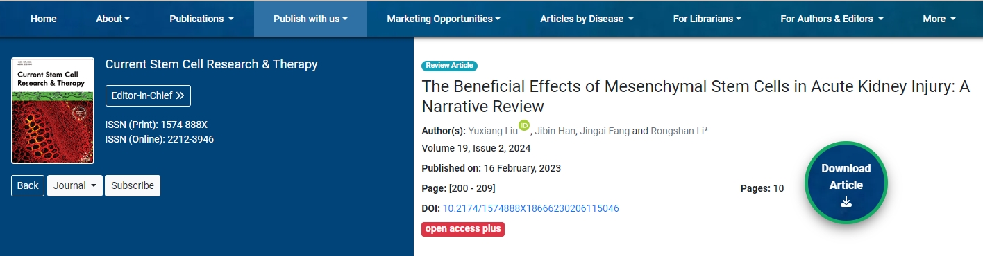 參考資料:Liu Y, Han J, Fang J, Li R. The Beneficial Effects of Mesenchymal Stem Cells in Acute Kidney Injury: A Narrative Review. Current Stem Cell Research & Therapy. 2024 ;19(2):200-209. DOI: 10.2174/1574888×18666230206115046. PMID: 36748221; PMCID: PMC10680085.
