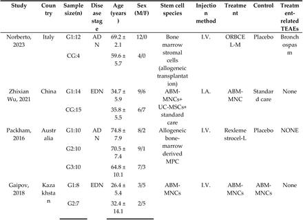 研究特征:基線數(shù)據(jù)和干預措施列于表1、2中。納入的研究發(fā)表于2016年至2023年之間,共有4篇文章和 90名參與者。共有53名 (58%) 患者接受了SCT。雖然所有納入的研究都應用了SCT,但來源、劑量、頻率和注射方式各不相同。所有四項研究均使用骨髓作為干細胞來源,其中一項研究使用臍帶MSCs。兩項研究采用同種異體給藥,兩項研究采用自體給藥。