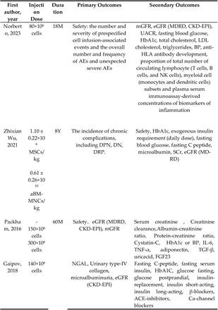 Norberto等人最近進行了一項1b/2a期多中心RCT,以評估成人同種異體骨髓基質干細胞移植對中重度DKD 患者的安全性、耐受性及治療效果。作者發(fā)現(xiàn),18周的SCT導致估計腎小球濾過率(eGFR)顯著改善,但不影響尿微量白蛋白/肌酐比值(UACR)。然而,Gaipov等發(fā)現(xiàn)SCT顯著降低微量白蛋白尿(MAU),而不影響eGFR或血清肌酐(SCr)水平。