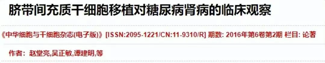 2016年《中華細(xì)胞與干細(xì)胞雜志》報道了第二軍醫(yī)大學(xué)臨床醫(yī)學(xué)院進(jìn)行臍帶間充質(zhì)干細(xì)胞移植干預(yù)糖尿病腎病的臨床案例,這場臨床研究共有15名糖尿病腎病患者。[1]