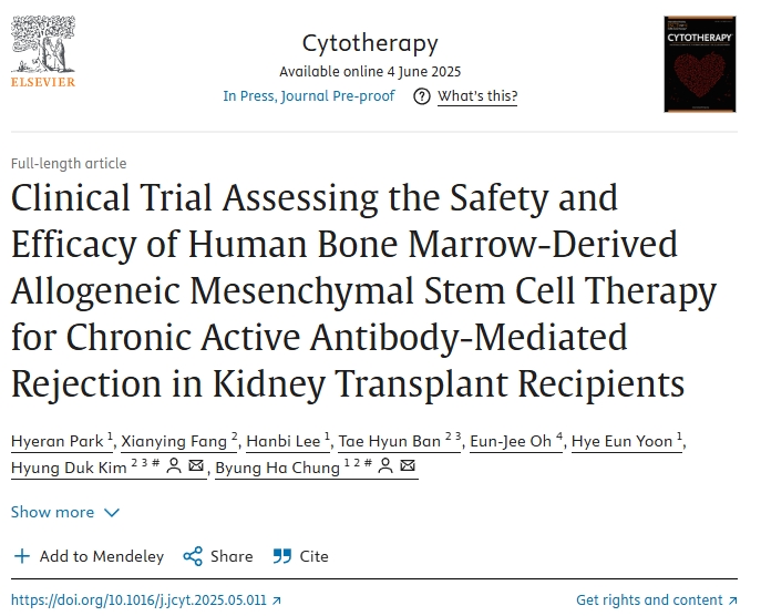 近期,國際權威期刊雜志《Cytotherapy》發表了一項“評估人骨髓異體間充質干細胞療法對腎移植受者慢性活動性抗體介導排斥反應的安全性和有效性的臨床試驗”[1]。