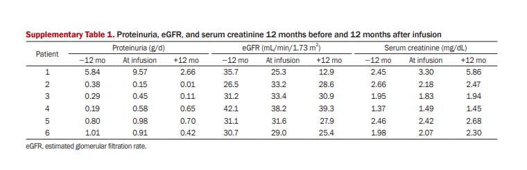 雖然并非所有6名患者的反應都相同,但這些結果表明,自體AT-MSC輸注減少了6名患者的24小時蛋白尿,而沒有明顯的不良反應。