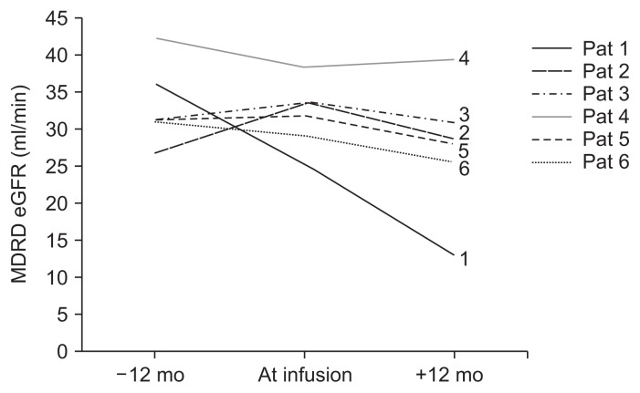 總體而言,通過血漿肌酐水平和MDRD eGFR評估的腎功能在MSC輸注后12個月時有所下降,盡管這種下降沒有統計學意義 ( P=0.065)。除患者4外,所有病例的eGFR均略有下降,范圍為7.5%至49.0%。