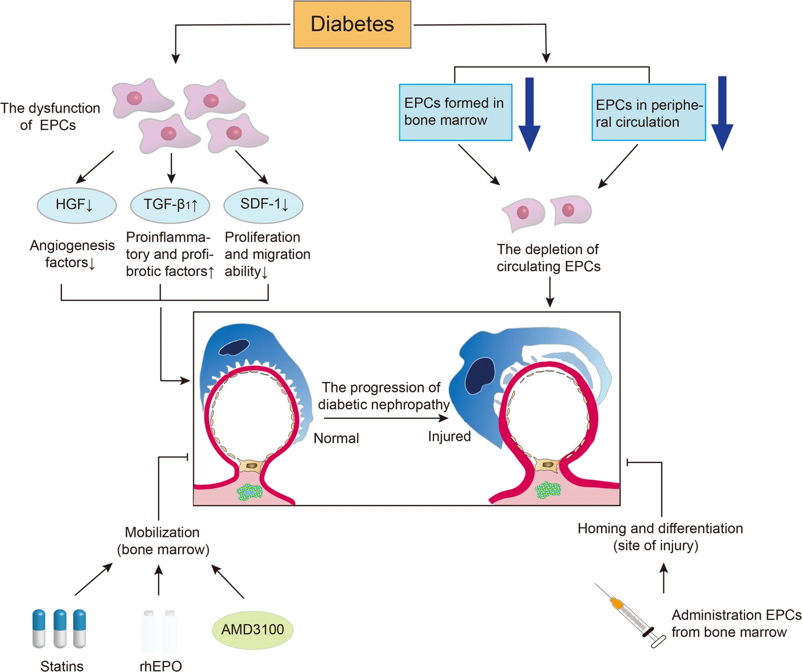 在糖尿病狀態下,內皮祖細胞(EPCs)的旁分泌功能受損,EPCs中血管生成因子的表達和EPCs的增殖和遷移能力降低,而TGF-β1等促炎和促纖維化因子的分泌受到抑制。增加。此外,循環內皮祖細胞的耗竭是由于骨髓中形成的內皮祖細胞和外周循環中內皮祖細胞的減少。糖尿病中EPCs循環水平降低和EPCs功能障礙可能導致糖尿病腎病(DN)的進展。相反,他汀類藥物、重組人促紅細胞生成素 (rhEPO) 和有效的 EPCs 動員劑 AMD3100 的給藥可以通過促進 EPCs 在骨髓中的動員來加速糖尿病患者傷口的愈合。此外,注射骨髓來源的EPCs能夠修復腎小球內皮損傷,可能達到治療DN的目的。