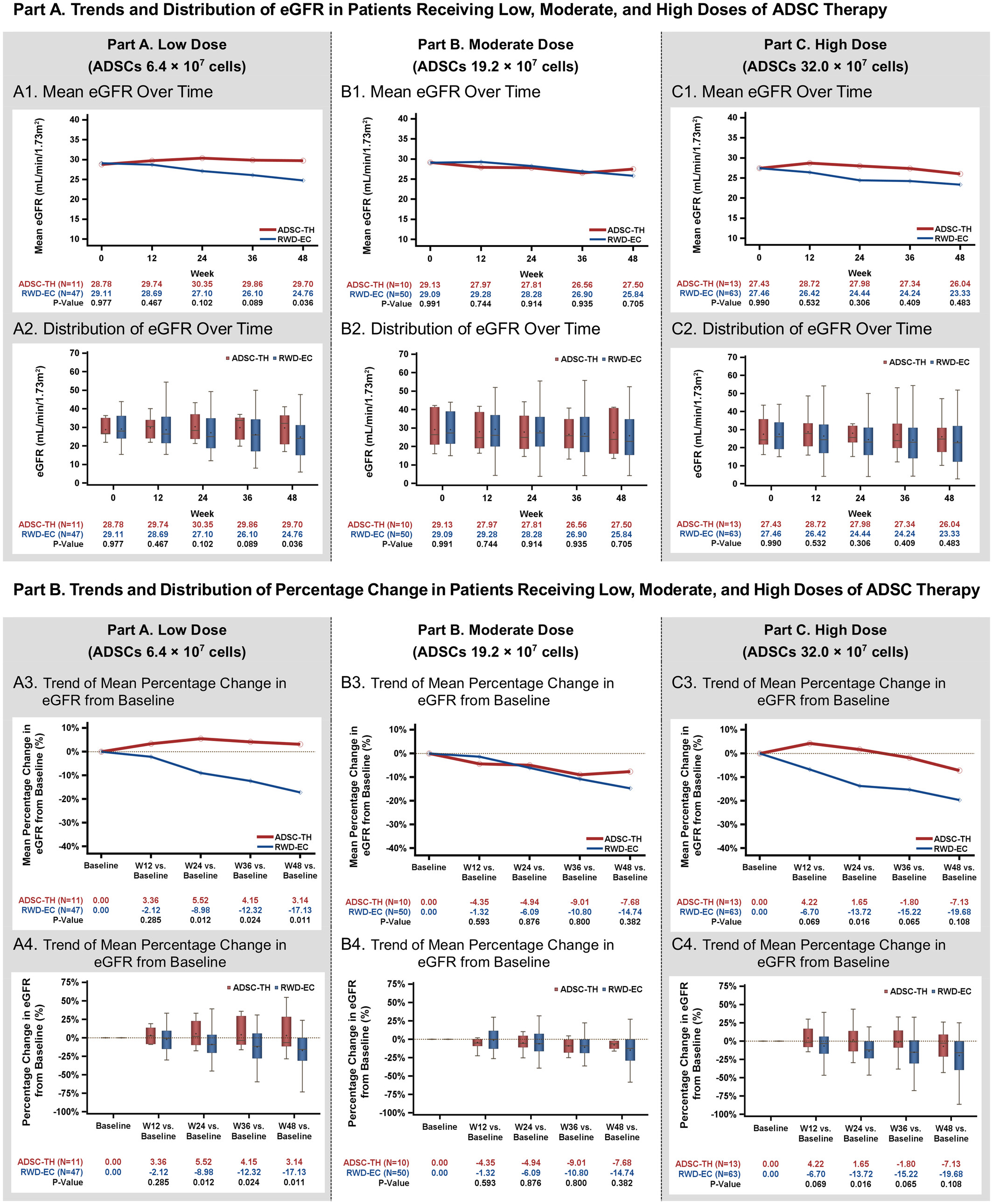 在CKD3期,兩組的eGFR百分比變化無顯著差異,表明總體穩定性良好。然而,在CKD4期,RWD EC組與ADSC治療組相比出現了統計學上的顯著下降,這表明在晚期CKD患者中,ADSC治療組的短期腎功能軌跡更加穩定。