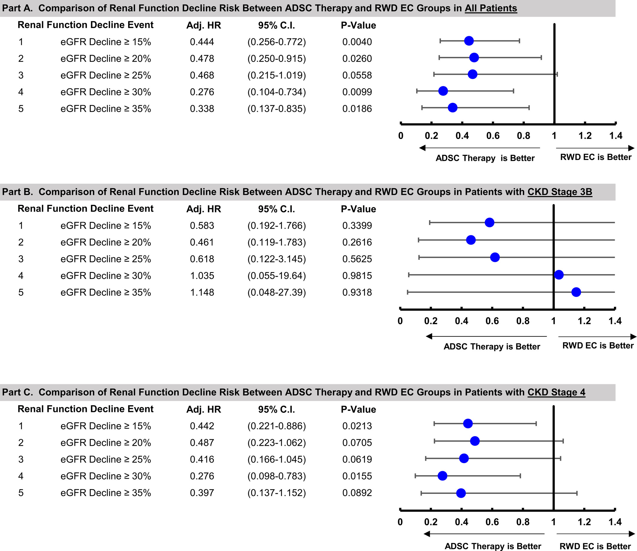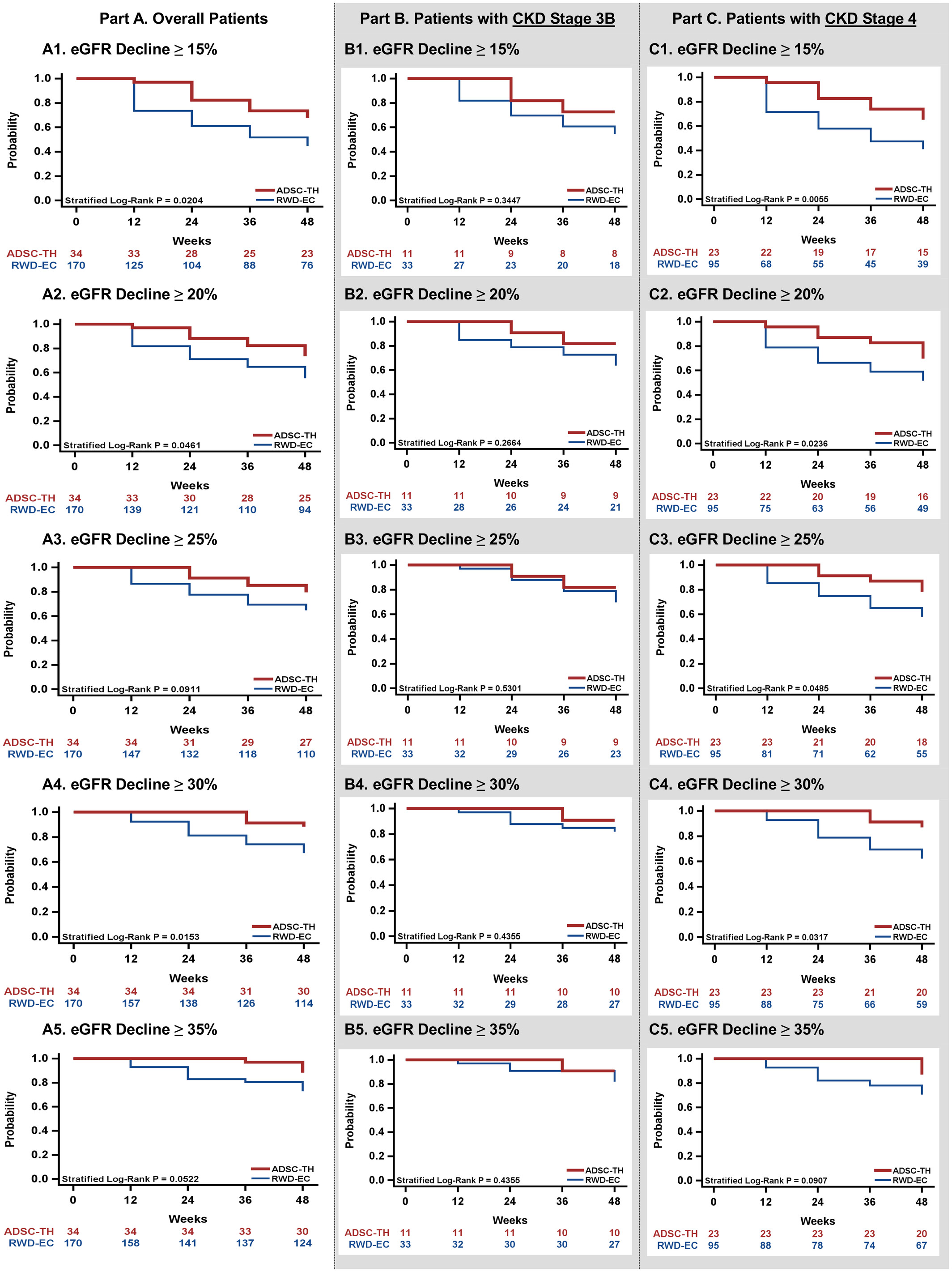 在ADSC治療組和RWD EC組中,我們評估了不同eGFR下降閾值下腎功能下降的風險,并按總體人群、CKD 3B期和CKD 4期進行分層(圖3)。