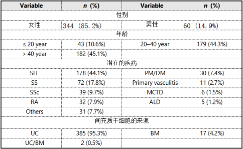 南京大學醫(yī)學院附屬鼓樓醫(yī)院風濕免疫科的梁軍、張華勇、孔偉等研究人員開展的大規(guī)模研究,全面探討了間充質干細胞治療自身免疫性疾病的安全性;發(fā)表在《干細胞研究與治療》上。研究人員對2007年至2016年在該醫(yī)院接受MSCI治療的404例不同自身免疫性疾病患者,平均年齡在輸注時為38.7歲(含26名未成年人)跟蹤觀察從1個月到9年,進行了回顧性研究。