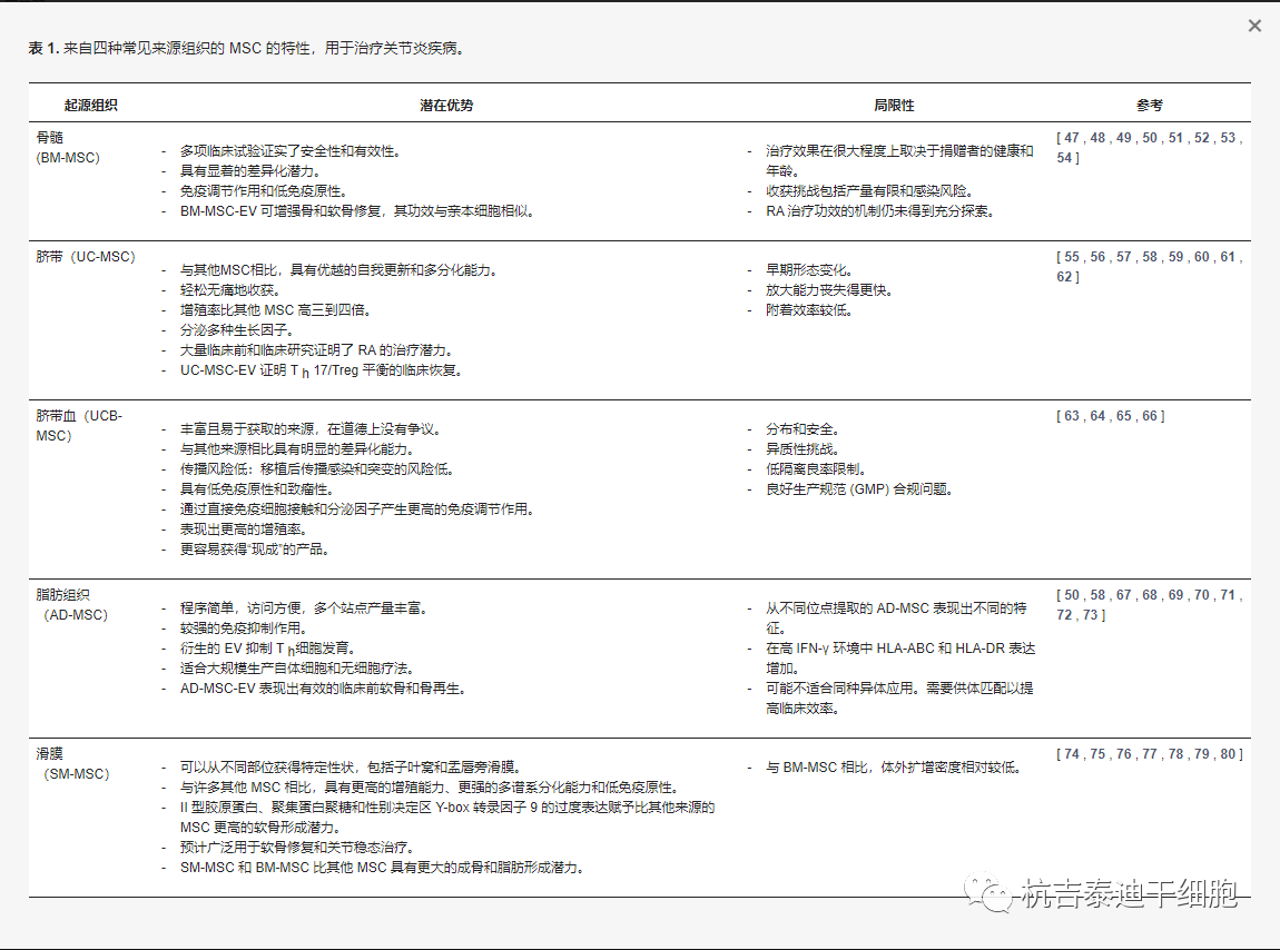 表1:來(lái)自四種常見來(lái)源組織的MSC的特性,用于治療關(guān)節(jié)炎疾病。