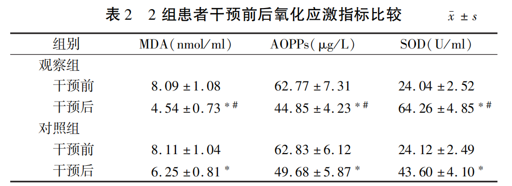 (3)氧化應(yīng)激指標(biāo):采集2組患者治療前后的空腹靜脈血3ml,3000r/min離心機中離心10min取血清,采用酶聯(lián)免疫吸附 (ELISA)檢測MDA、AOPPs、SOD水平。?