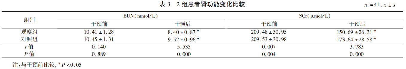 2組患者腎功能比較:治療前,2組患者的BUN、SCr水平差異無統(tǒng)計學(xué)意義(P>0.05);治療后,2組BUN、SCr水平明顯降低(P<0.05),與對照組比較,觀察組的BUN、SCr降低更明顯,差異有統(tǒng)計學(xué)意義(P<0.05)。見表3。