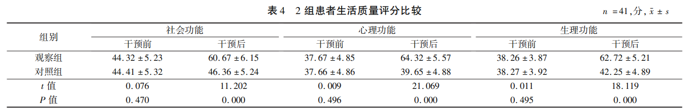 2組患者生活質(zhì)量評分比較:干預(yù)前,2組患者生理功能、社會功能、心理功能得分差異無統(tǒng)計學(xué)意義 (P>0.05)。 干預(yù)后,觀察組生理功能、社會功能、心理功能得分高于對照組(P<0.05)。見表4。