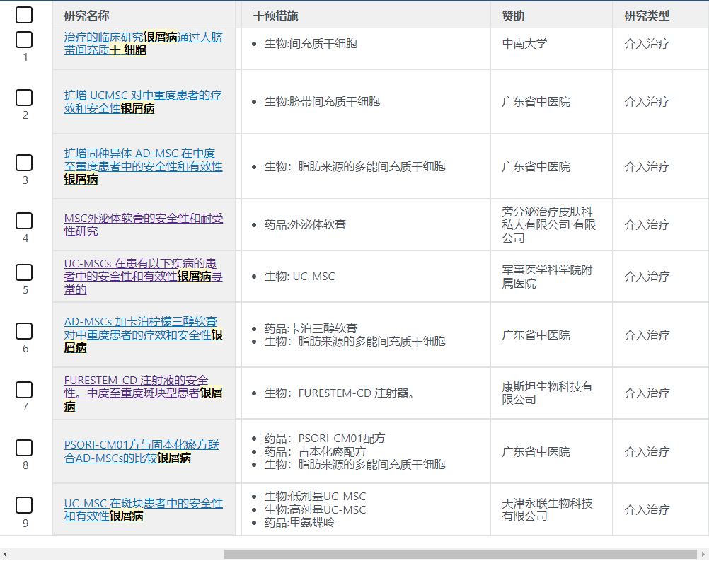 截止2023年8月,在美國(guó)國(guó)立衛(wèi)生研究院的最大臨床試驗(yàn)注冊(cè)庫(kù)clinicaltrials.gov網(wǎng)站上注冊(cè)的有關(guān)干細(xì)胞治療銀屑病的臨床研究項(xiàng)目有9項(xiàng)。其中在國(guó)內(nèi)的臨床研究有7項(xiàng)。