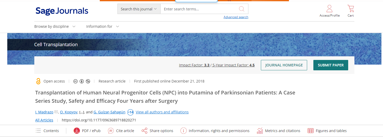 2019年,墨西哥總醫院在8名中度PD患者中測試了人類神經祖細胞 (NPC)。該文獻發表在《細胞移植》期刊上,研究人員使用現代手術,將NPC懸浮液注射到患者的雙側殼核中。細胞移植一年后,患者表現出不同程度的運動改善,其中五名患者對藥物表現出更好的反應。中腦的多巴胺能活性增加。經過4年的治療,進展略有下降,但仍然好于最初。還注意到殼核背側多巴胺能神經傳遞的增加,這可能與運動功能的改善相關。