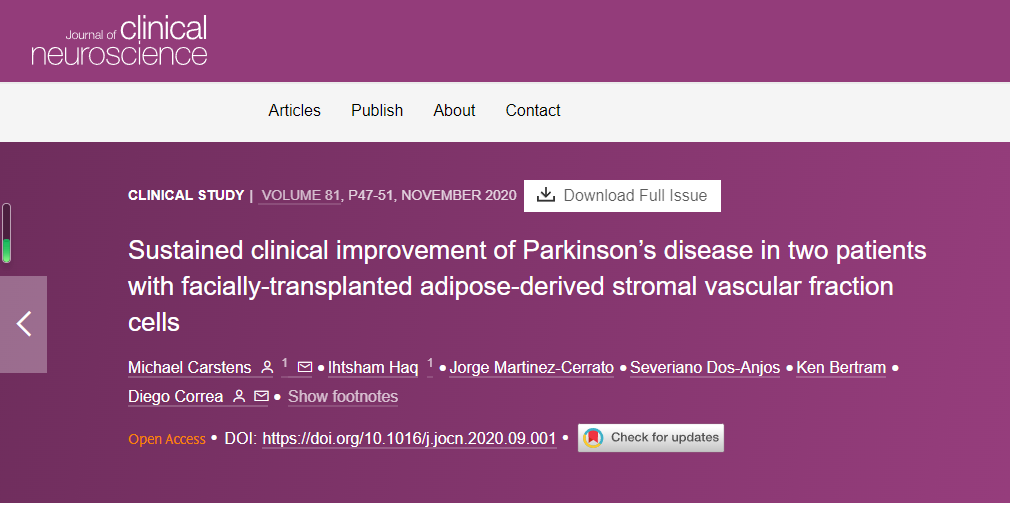 2020年維克森林大學再生醫學研究所,兩名PD患者接受了自體脂肪源性血管基質成分 (SVF) 治療。它們被直接給予面部和鼻子的肌肉。SVF后,兩名患者的運動表現均有所改善,且多巴胺能治療水平較低。盡管作用機制未知,但這種潛在的療法需要進一步研究。