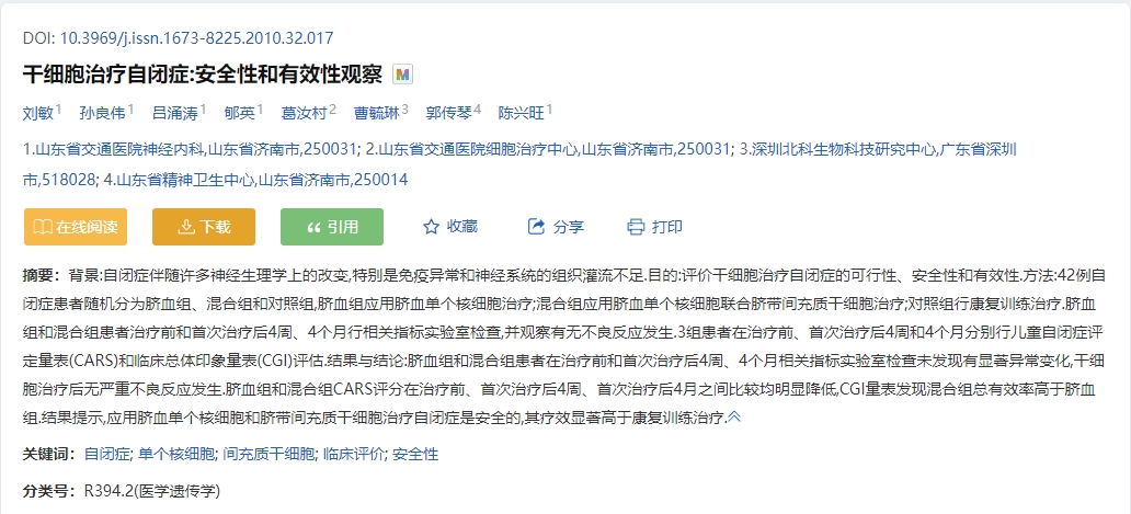 案例一:2010年,《中國組織工程研究與臨床康復》期刊雜志發表了一篇干細胞治療自閉癥:安全性和有效性觀察的臨床案例[1]。