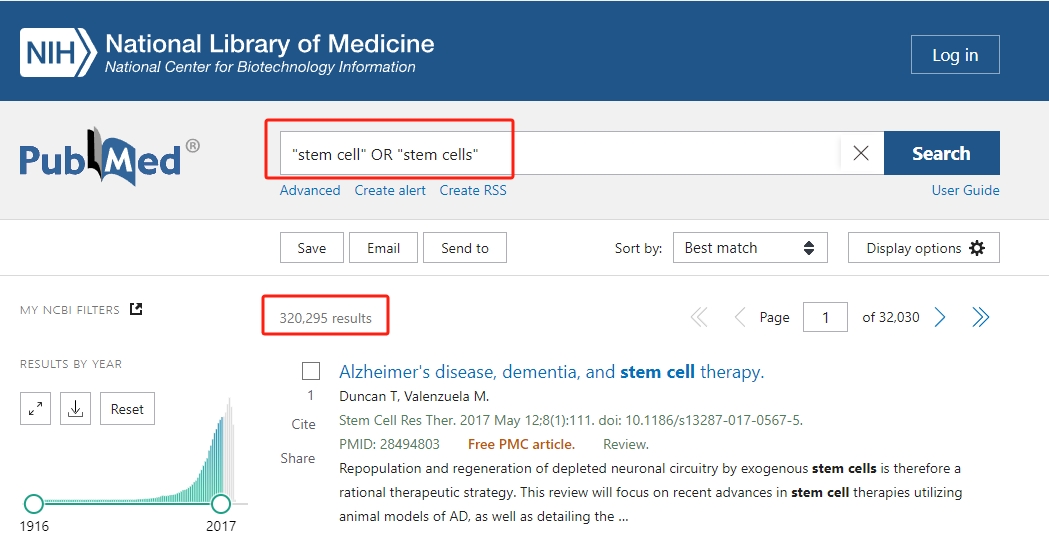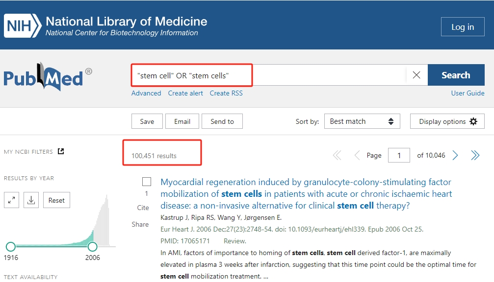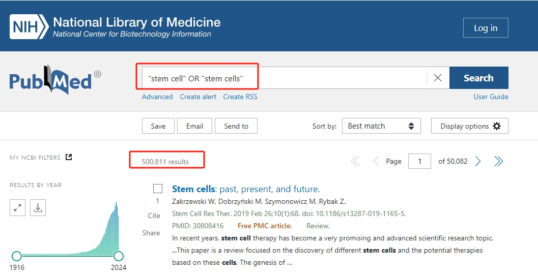 盡管起步卑微,干細胞界在本月實現(xiàn)了一個令人震驚的里程碑,有關干細胞的科學論文數(shù)量猛增至50萬篇以上。要親自驗證這一發(fā)現(xiàn),請在PubMed上使用搜索短語(”干細胞 “和 “干細胞”),如下所示。