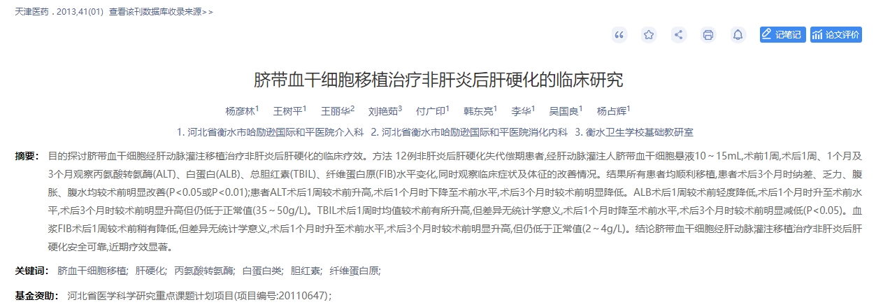 2013年,天津醫藥期刊發表了一篇臍帶血干細胞移植治療非肝炎后肝硬化的臨床研究[1]。