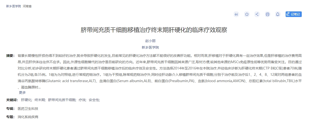 2019年,中國知網在刊發了一篇新鄉醫學院進行了一項臍帶間充質干細胞移植治療終末期肝硬化的臨床療效觀察的論文[7]。