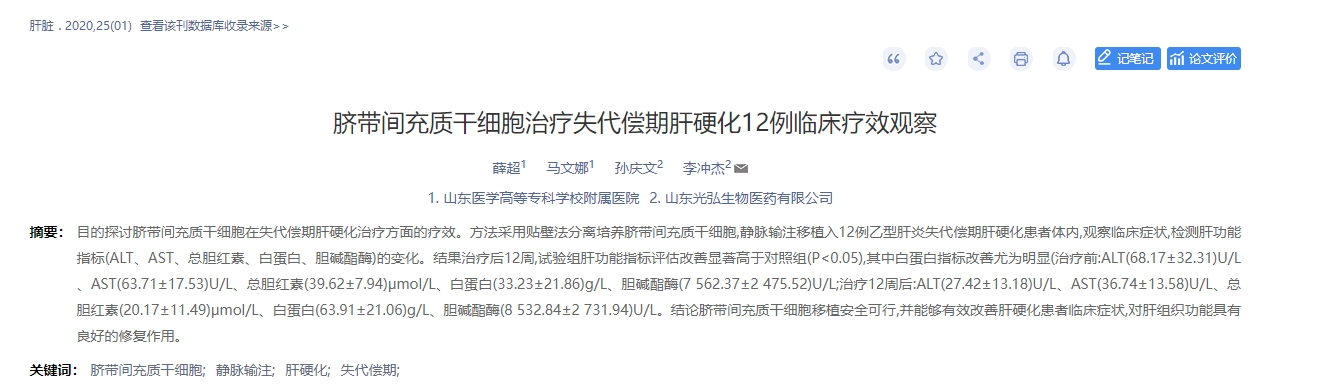 2020年,中國肝臟雜志刊發了一篇臍帶間充質干細胞治療失代償期肝硬化12例臨床療效觀察的文章[8]。