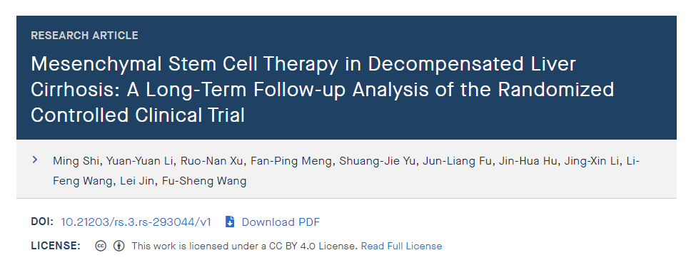 2021年,國內王福生院士的最新研究結果顯示,臍帶間充質干細胞顯著改善失代償性肝硬化的肝功能及長期生存率。相關研究結果(預印本)在國際肝病學雜志(Hepatology International)審議中[9]。