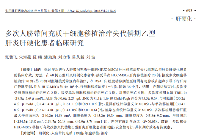 2017年,實用肝臟病雜志刊發了一篇人臍帶血干細胞治療失代償期酒精性肝硬化臨床觀察的文章[5]。
