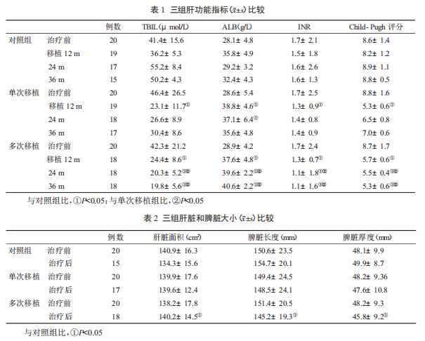 在60例乙型肝炎肝硬化患者中,接受單次HUC-MSCs肝內移植治療2例,接受多次細胞移植治療20例,另20例對照組接受常規內科治療。在隨訪12個月和24個月后,三組肝功能指標變化的比較:單次移植組血清ALB水平顯著高于對照組;在隨訪36個月結束時,多次移植組血清TBIL、ALB、INR和Child-Pugh評分與單次移植組和對照組相比,均有顯著統計學差異;在隨訪36個月結束時,多次接受細胞移植患者肝臟最大平掃面積較對照組顯著增大,脾臟長度和厚度較對照組顯著縮小。