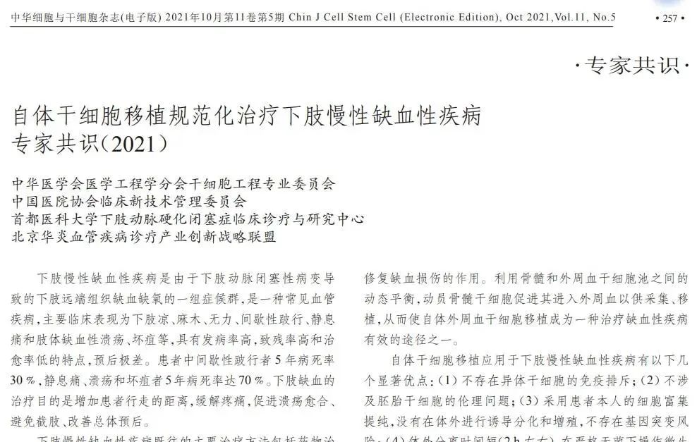2021年10月在《中華細胞與干細胞雜志( 電子版》(第11第5期 上發表的《自體干細胞移植規范化治療下肢慢性缺血性疾病專家共識( 2021)》,其中提到,自體干細胞移植對下肢慢性缺血性疾病治療的安全性和有效性已成為學界公認。