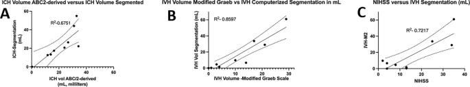 ABC/2模型1和模型2分割方法通過ICH和IVH體積的線性回歸顯示出良好的相關性(圖3a、b)。與模型2分割體積方法(例如,每個CT15-20分鐘)相比,模型1ABC/2派生的半定量方法和改進的Graeb IVH方法完成時間較短(例如,2-5分鐘)。有趣的是,NIHSS評分與IVH體積M2方法的比較顯示出線性相關性(R 2 ?= 0.7217),并且當IVH小于20mL或大于20mL時,NIHSS評分似乎出現(xiàn)聚類(圖3c)。PHE分析顯示MSC注射劑量和PHE體積之間存在輕微的負相關關系。