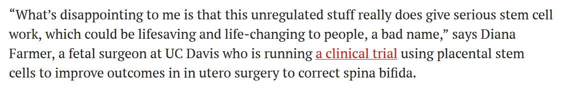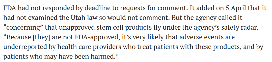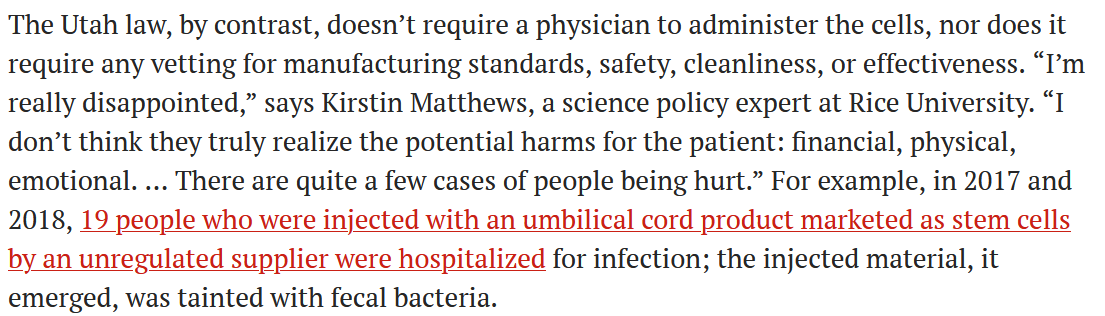 萊斯大學的科學政策專家Kirstin Matthews表示:與其他州相比,猶他州的法律不需要醫生來管理細胞,也不需要對細胞的制造標準、安全性、清潔度和有效性進行審查,政府工作人員并未認識到這對患者在經濟上、身體上和情感上的傷害,在2017年和2018年就發生過19人因注射了市面上銷售的不受監管的臍帶干細胞產品,感染住院,后被發現,注射的材料被糞便細菌污染了。