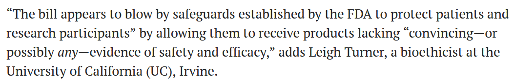 加州大學生物倫理學家 Leigh Turner表示:這一法案沖破了FDA為患者和受試者建立的安全屏障,讓他們接受缺乏安全性和有效性證據的產品。