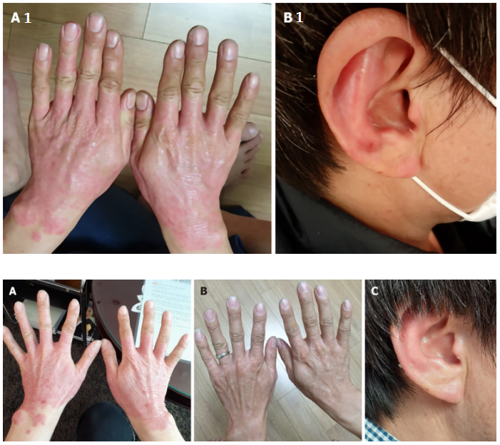圖:A1,B1為治療前,A治療后15天,B、C治療后122天,可見紅斑已消退在治療過程中,該患者未出現包括皮炎、發燒、發冷或惡心等不良反應,證實了間充質干細胞治療的安全性和有效性。