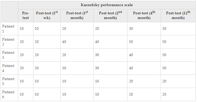 我們用來(lái)評(píng)估痙攣的MAS值在左側(cè)和右側(cè)均顯著下降。FIM量表包括運(yùn)動(dòng)得分和認(rèn)知得分,并在前測(cè)后測(cè)分析中顯示顯著增加。干預(yù)前后參與者的卡氏能力量表值的差異具有統(tǒng)計(jì)學(xué)意義。