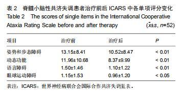 38例脊髓小腦性共濟失調患者52個療程治療中,44個療程有效,有效率為84.6%, 38例脊髓小腦性共濟失調患者52個療程治療結束1個月與治療前比較,ICARS、ADL評分差異均有顯著性意義。