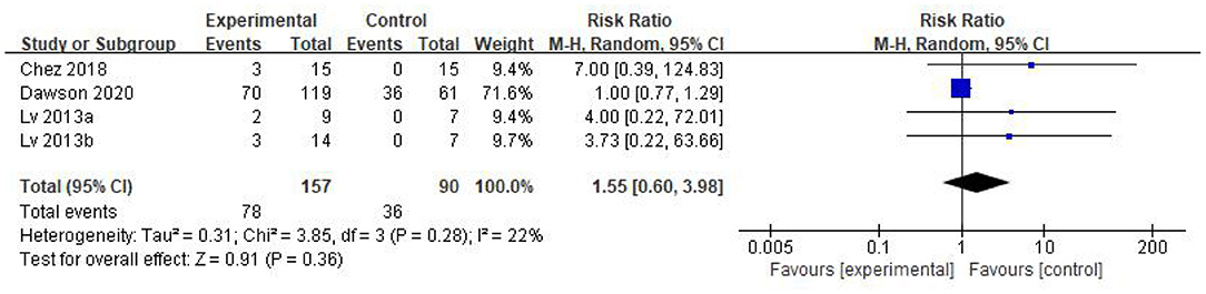圖6中的森林圖反映了各組不良反應(yīng)的發(fā)生事件[RR=1.55;95%CI = (0.60, 3.98); p=0.36; 圖6],干細(xì)胞組與對(duì)照組的不良反應(yīng)發(fā)生率無(wú)顯著差異,異質(zhì)性檢驗(yàn)p=0.28;我2=22%。基于森林地圖,我們有視覺(jué)異常值。敏感性分析發(fā)現(xiàn),道森等人的研究是一個(gè)異常值,是異質(zhì)性的原因。而排除Dawson等人的研究后,結(jié)果更穩(wěn)定 [RR=4.70;95%CI= (0.90, 24.63); p=0.07;異質(zhì)性檢驗(yàn)p= 0.95; 我2=0%]。