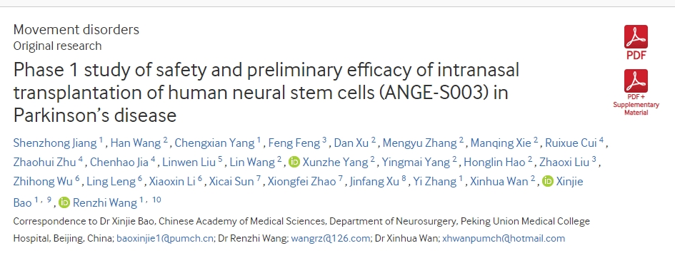 2024年5月10日,北京協(xié)和醫(yī)院神經(jīng)外科王任直教授、包新杰教授和神經(jīng)內(nèi)科萬新華教授團(tuán)隊(duì)從5年前啟動(dòng)了一項(xiàng)《人類神經(jīng)干細(xì)胞鼻腔內(nèi)移植治療帕金森病的安全性及初步療效的1期研究(ANGE-S003)》的臨床研究成果在國際期刊《Journal of Neurology, Neurosurgery& Psychiatry》上發(fā)表。[3]