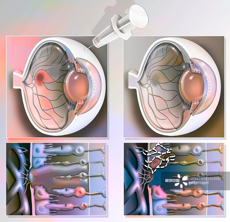 濕性AMD:對(duì)于濕性AMD,醫(yī)生使用藥物治療和手術(shù)技術(shù)來(lái)幫助保持現(xiàn)有視力。目前的一線治療是向患眼注射藥物以抑制新血管的形成。這些藥物會(huì)阻止血管內(nèi)皮生長(zhǎng)因子或VEGF的產(chǎn)生,VEGF會(huì)向身體發(fā)出信號(hào)以制造新血管。對(duì)于許多人來(lái)說(shuō),需要每四到六周重復(fù)注射一次。