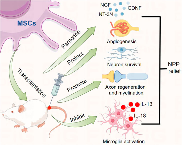 總結(jié):這些研究表明MSCs可以分化神經(jīng)元,保護(hù)神經(jīng)元存活,促進(jìn)軸突再生和髓鞘形成,達(dá)到鎮(zhèn)痛作用,通過促進(jìn)軸突再生、保護(hù)神經(jīng)元存活來取代軸突溶解脫髓鞘和神經(jīng)元分化是緩解NPP的關(guān)鍵(圖1)。